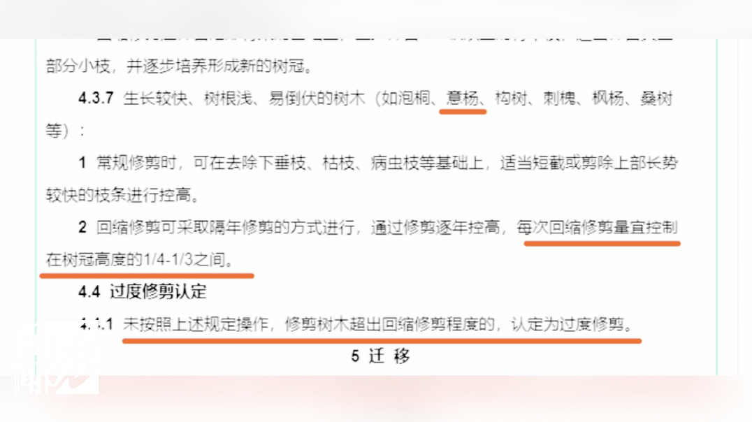 当记者问道为何小区南边的一些树木并不在高压线边,反而一些修剪得更为严重,该绿化部门工作人员解释,“因为意杨树有特殊性,生长速度极快,材质疏松、极易折断,尤其是当今特殊气候越来越多的情况下,若是折断后,往外掉是高架,往里掉是小区居民和车辆,造成人身财产危险,所以统一修到8米,这是合法合规的。”