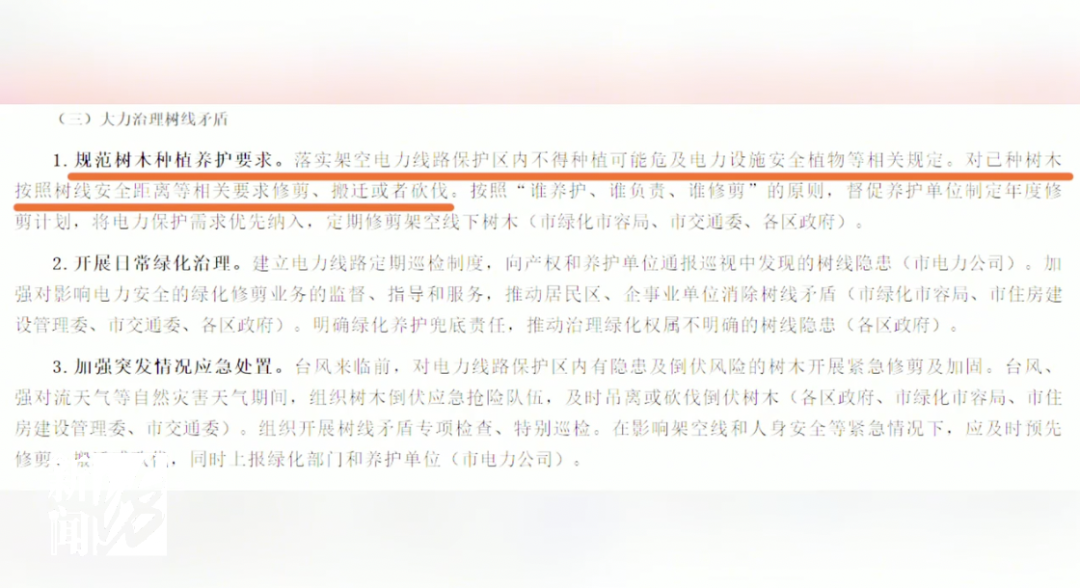 对此,闵行区绿化部门则表示:按照本市出台的《进一步加强电力设施保护 提升城市供电安全水平的实施意见》:当发生"树线矛盾"时,电力线路保护区内已种植的植物,应当按照树线安全距离要求修剪、搬迁或者砍伐。